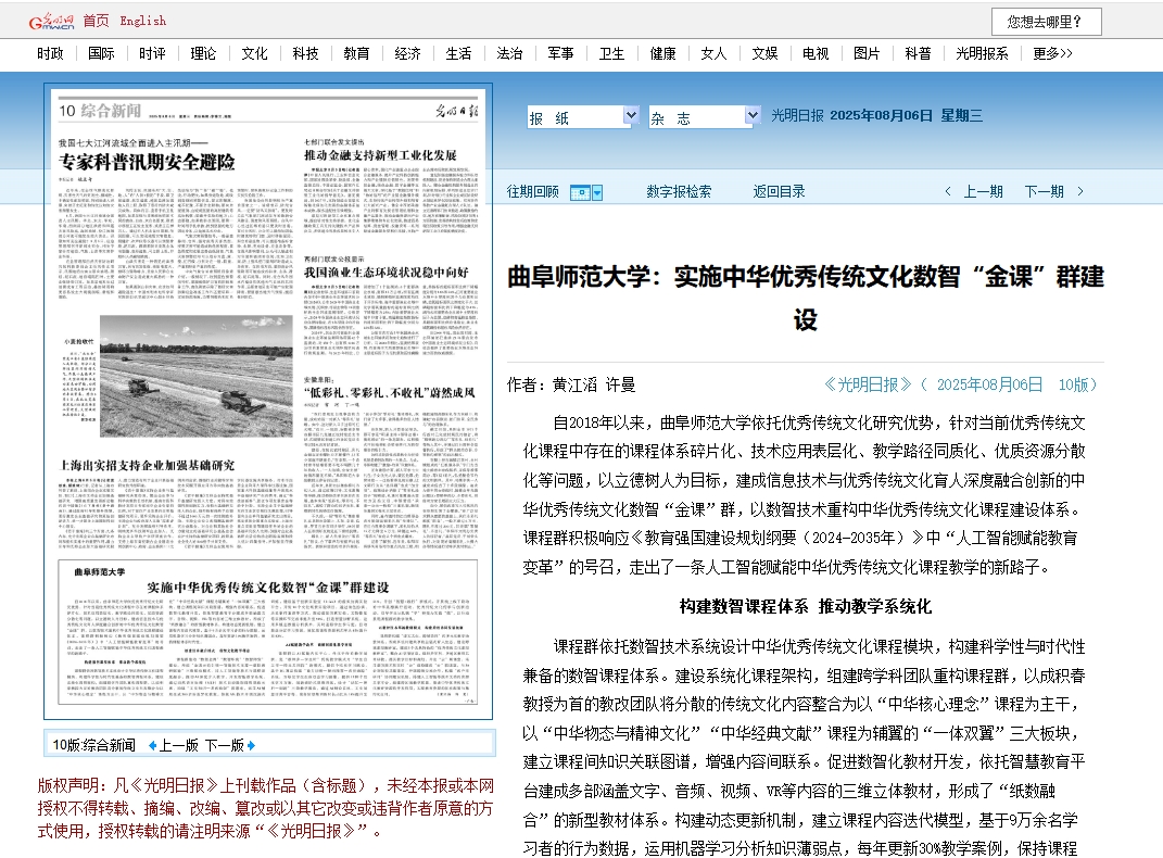 米乐网页登录讯 8月6日,《光明日报》以《米乐(中国)实施中华优秀传统文化数智“金课”群建设》为题,报道了学校积极响应《教育强国建设规划纲要(2024-2035年)》中“人工智能赋能教育变革”的号召,依托优秀传统文化研究优势,聚焦优秀传统文化课程中存在的课程体系碎片化、技术应用表层化、教学路径同质化、优质资源分散化等问题,以数智技术重构中华优秀传统文化课程建设体系,建成信息技术与优秀传统文化育人深度融合创新的中华优秀传统文化数智“金课”群,走出了一条人工智能赋能中华优秀传统文化课程教学新路子的特色实践。