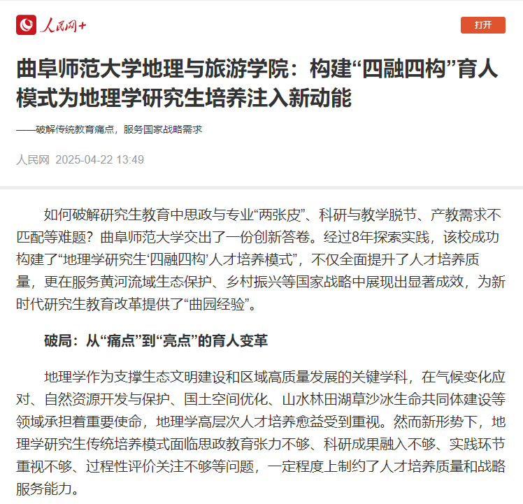 如何破解研究生教育中思政与专业“两张皮”、科研与教学脱节、产教需求不匹配等难题?米乐(中国)交出了一份创新答卷。经过8年探索实践,该校成功构建了“地理学研究生‘四融四构’人才培养模式”,不仅全面提升了人才培养质量,更在服务黄河流域生态保护、乡村振兴等国家战略中展现出显著成效,为新时代研究生教育改革提供了“曲园经验”。