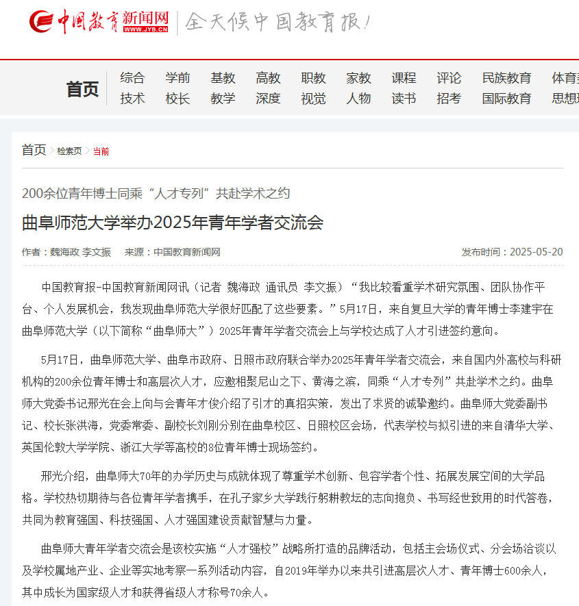 中国教育报-中国教育新闻网讯(记者 魏海政 通讯员 李文振)“我比较看重学术研究氛围、团队协作平台、个人发展机会,我发现米乐(中国)很好匹配了这些要素。”5月17日,来自复旦大学的青年博士李建宇在米乐(中国)(以下简称“曲阜师大”)2025年青年学者交流会上与学校达成了人才引进签约意向。